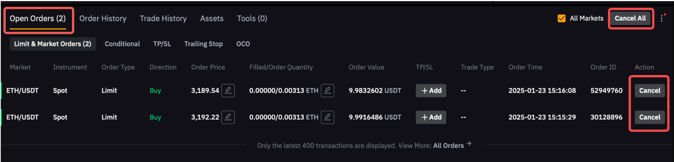 To cancel Spot orders, navigate to the Current Orders tab and click on Cancel. Alternatively, you can choose to Cancel All orders from the upper right corner. It's important to note that if you have selected the Show all trading pairs option, clicking on Cancel All will cancel orders from all trading pairs.