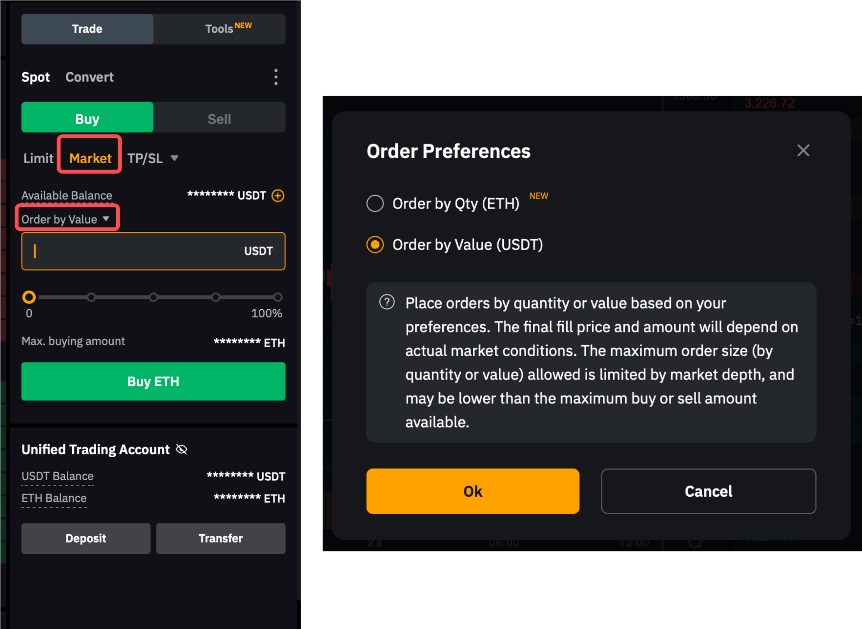 For market buy and sell orders, the default is to place an order by value (market buy) and by quantity (market sell). You can click on Order by Value or Order by Qty to switch your order placement preferences.