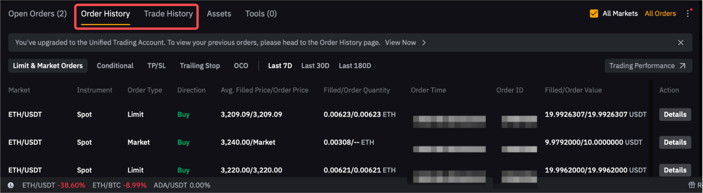 You can switch to the Order History or Trade History tab on the Spot Trading page to view up to 50 records from the last six (6) months. Similar to Current Orders, you can check the Show all trading pairs box to view order history or trade history from all trading pairs.