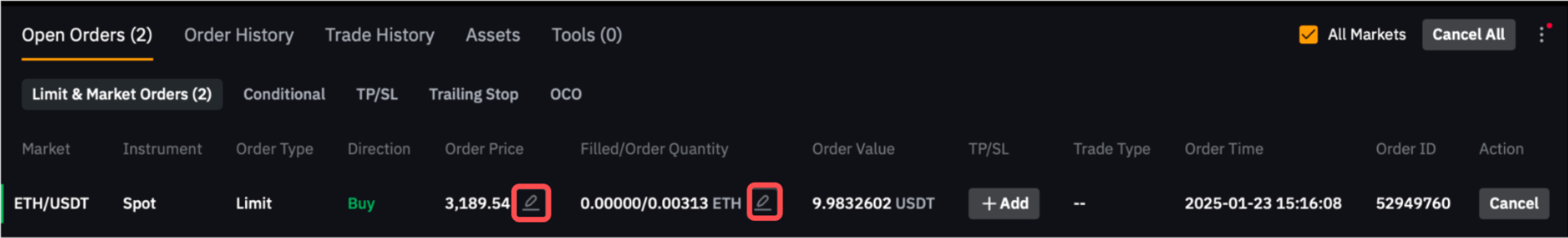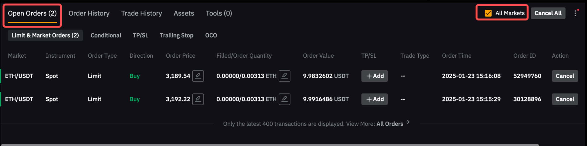 You can view your current unfilled or untriggered orders on the Current Orders tab. To show all current orders across all trading pairs, you can check the All Markets box.