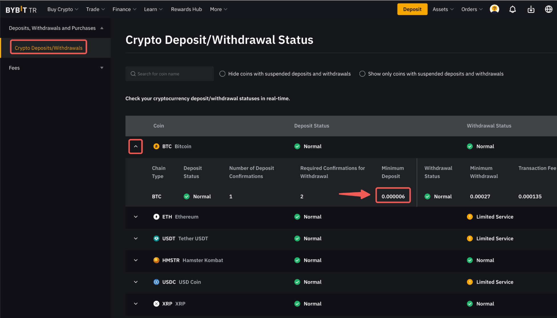 You can find the list of minimum deposit amounts for each coin on the Crypto Deposit/Withdrawal Status page. Kindly click on the dropdown button of the coin you would like to deposit or withdraw to view the deposit status for each supported chain type, as well as the necessary information to perform a successful deposit.