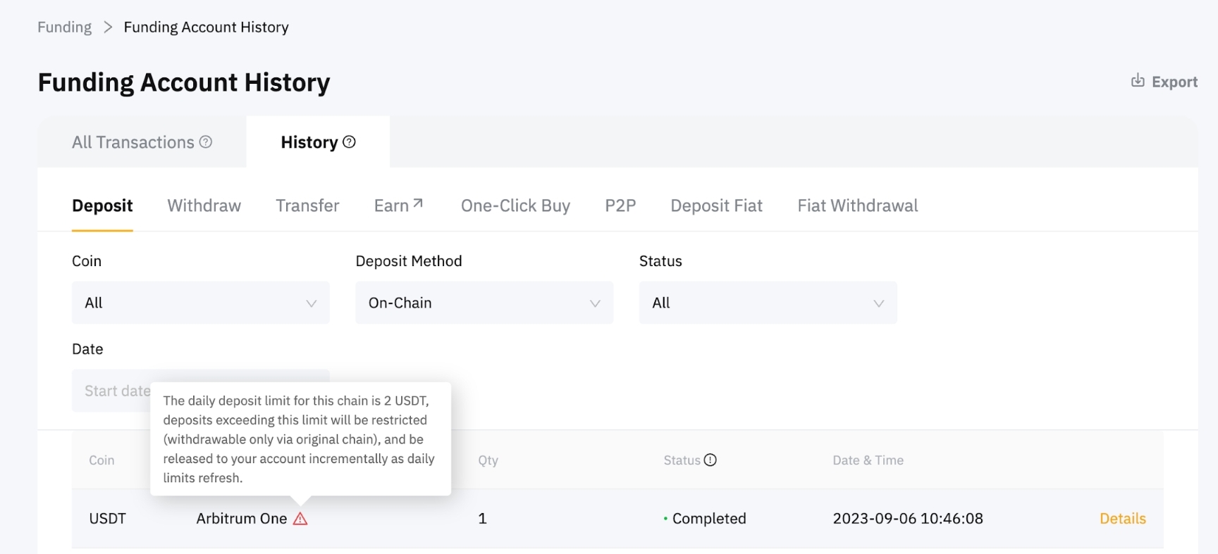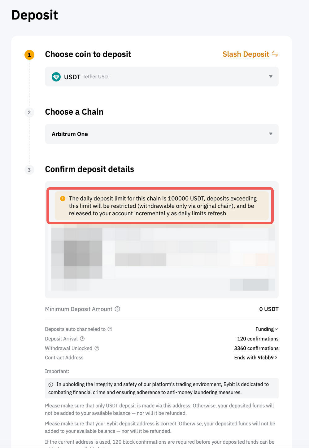 For example, the deposit limit for USDT via Arbi Chain is 100,000 USDT and your total pending asset for USDT is 300,000 USDT. The 300,000 USDT will be released to your account in three days, with 100,000 USDT released per day.