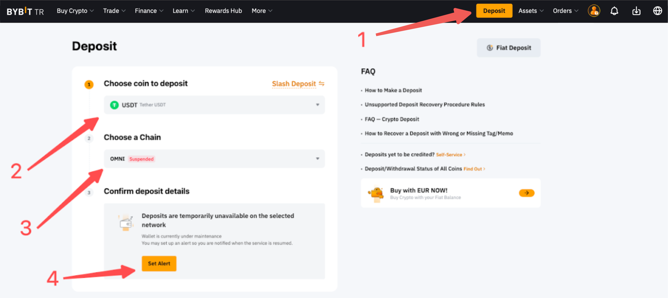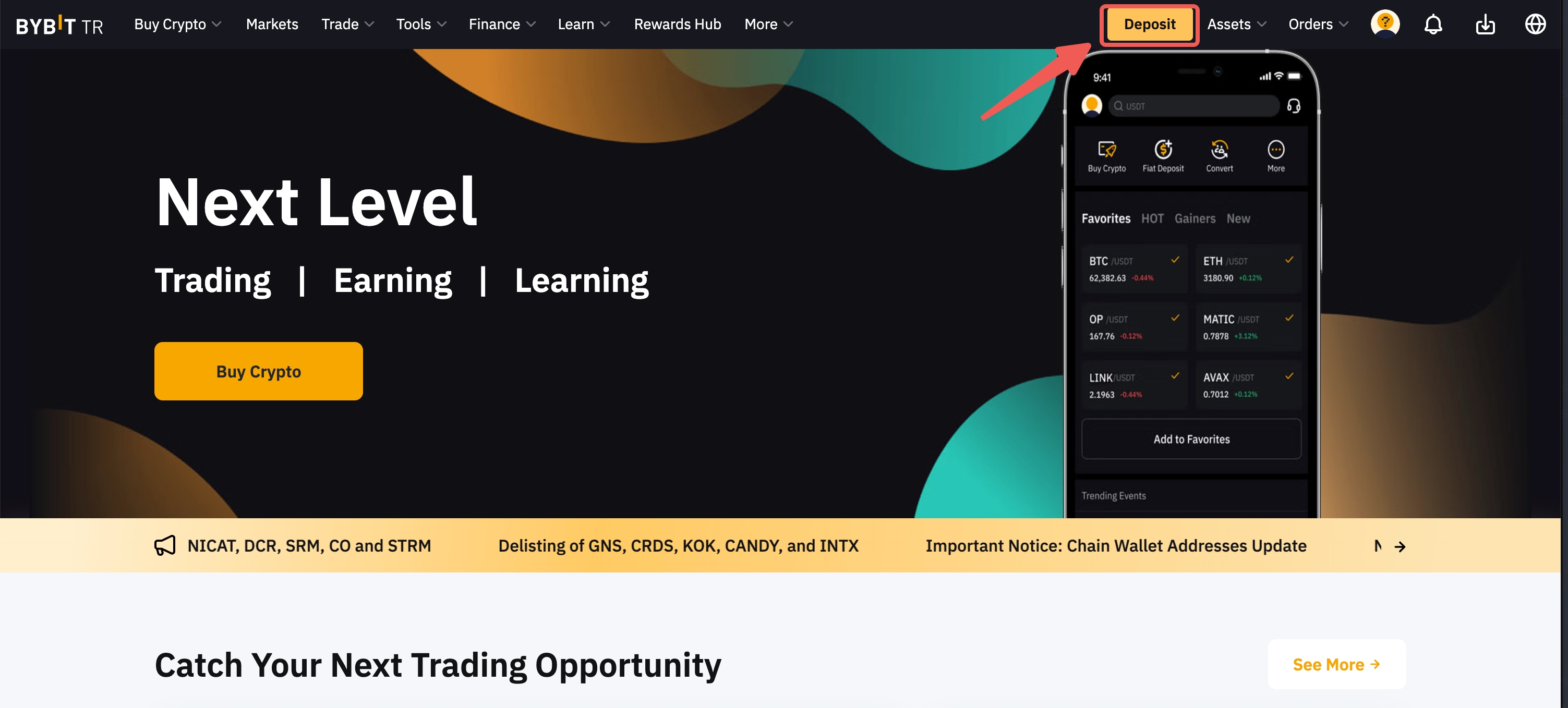Alternatively, you can also locate the Deposit entrance in the upper right corner of the Bybit TR page.