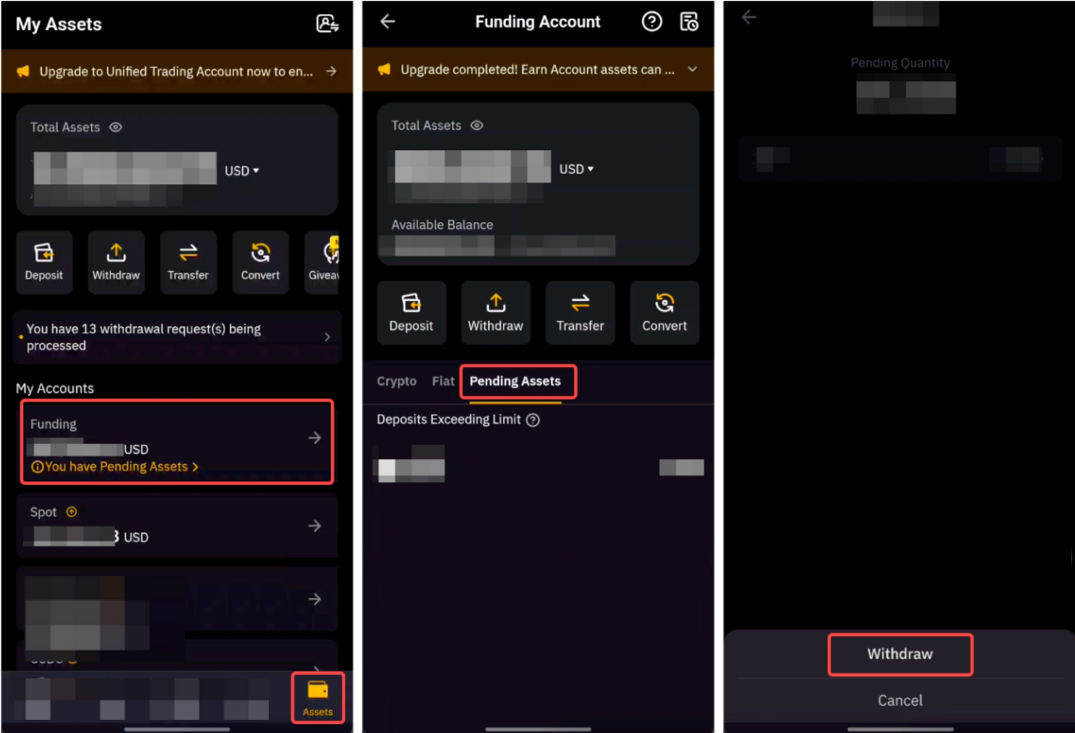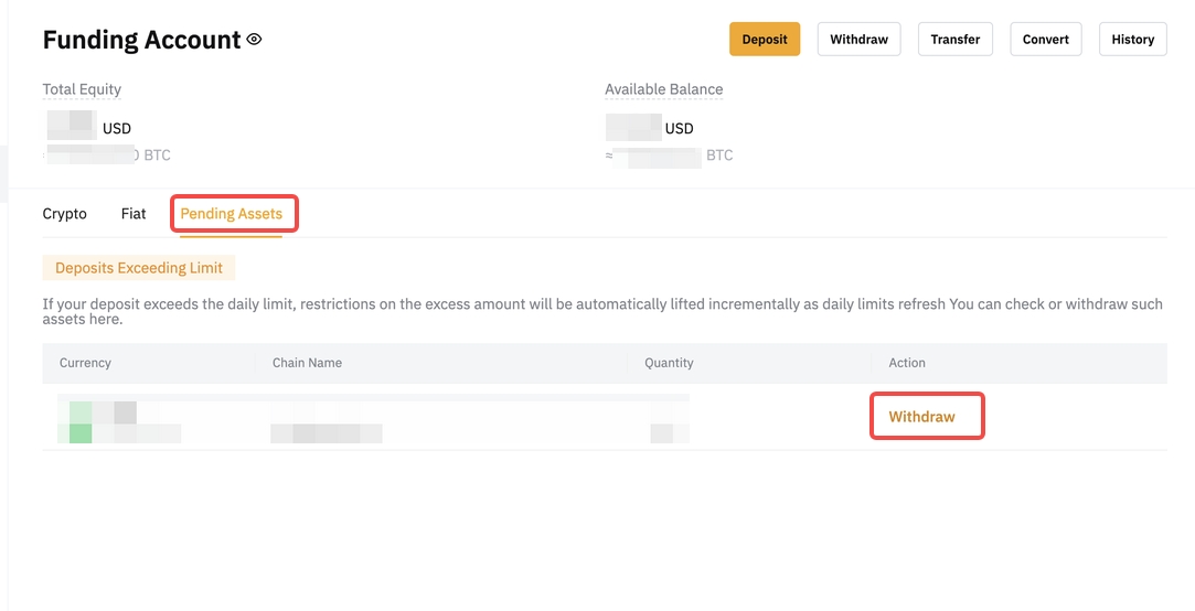 Pending Assets refer to deposits awaiting credit confirmation for a specific blockchain. These deposits require additional time before they can be accessed for trading or withdrawal, in alignment with the deposit credit limit.