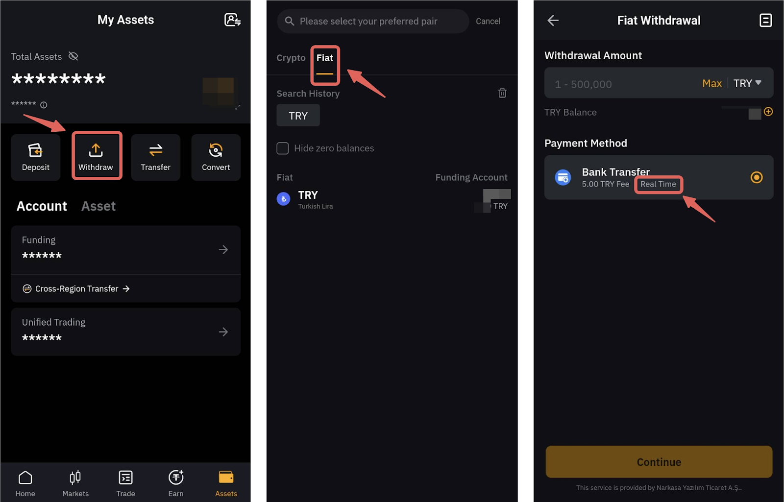 On the App, go to the Assets tab and tap on Withdraw, then switch to Fiat section. Then, tap on the Fiat currency and refer to the associated processing time for each payment method.