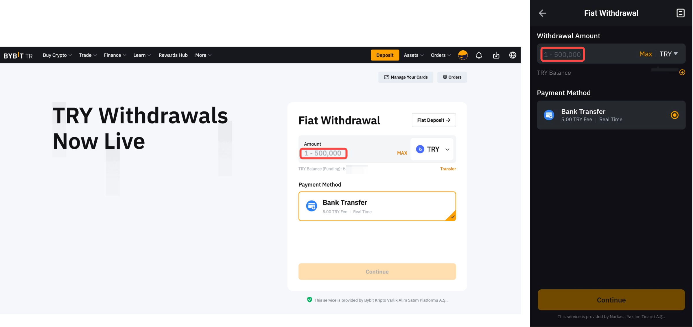 Only a selected amount of fiat currencies are available for withdrawal on Bybit TR. You will be able to see the fiat currencies supported for fiat withdrawal on the Fiat Withdrawal page.