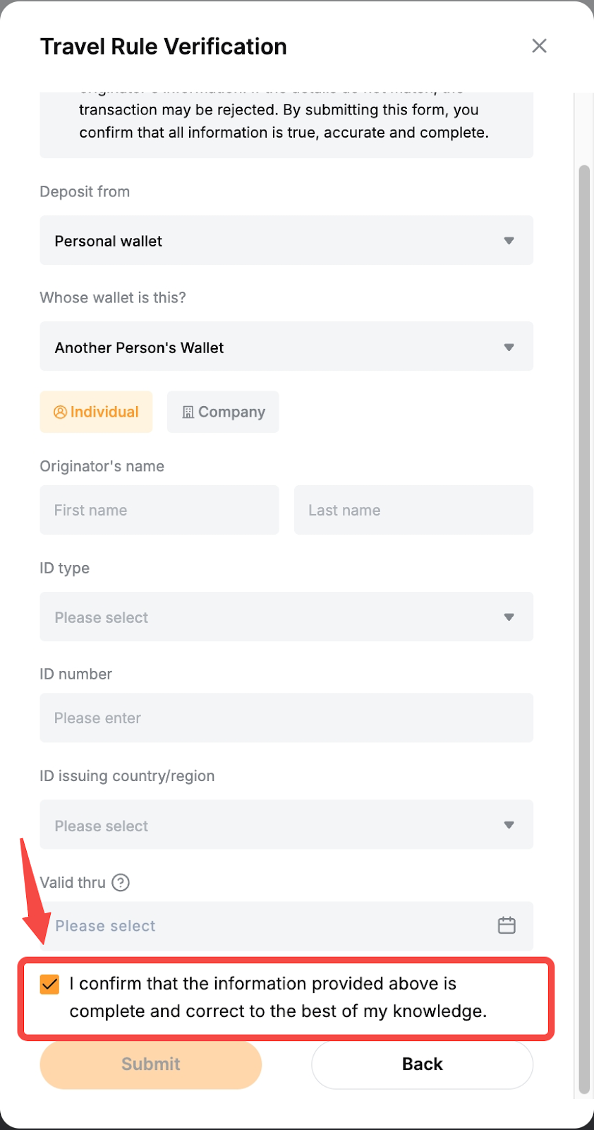 Note: Please acknowledge that the information provided is true, accurate and complete by ticking the checkbox under the Travel rule verification window.