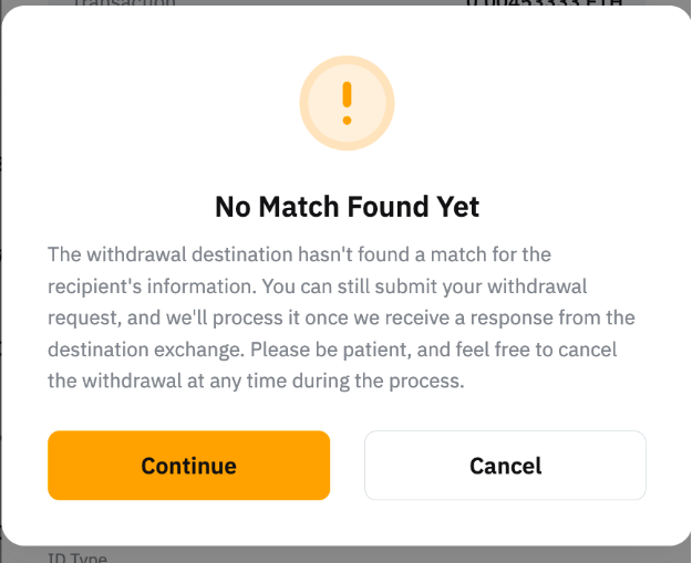 This can happen when the withdrawal destination has not found a match for the recipient information you provided. You can still submit your withdrawal request, and it will be processed once we receive a response from the destination exchange. Please refresh the page to check the latest status. You can cancel the withdrawal at any time during the process.