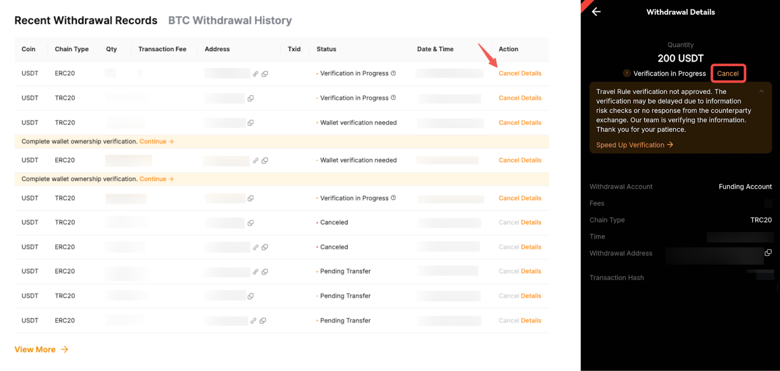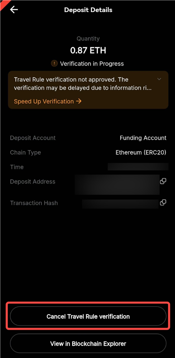 On the App, enter the deposit details page from the Deposit History page and click on the Cancel Travel Rule button.