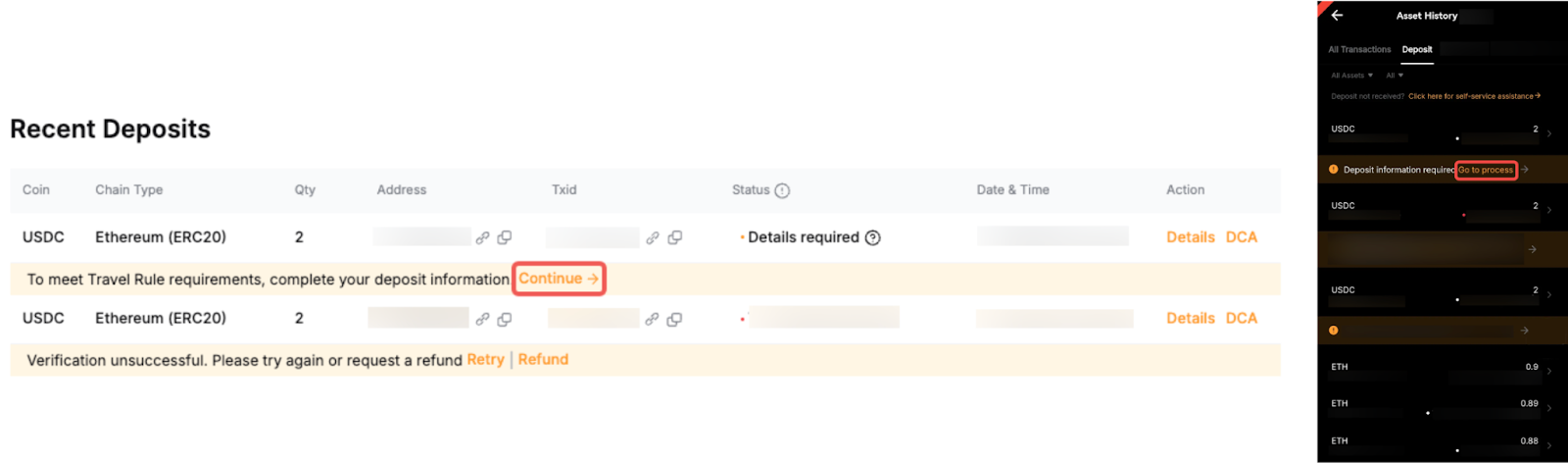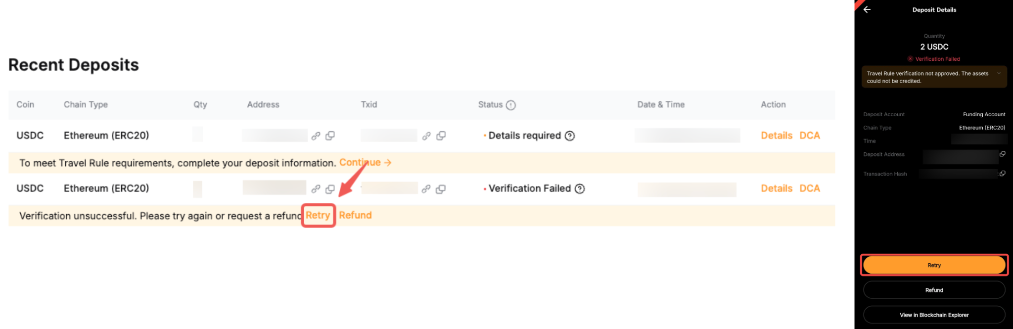If your wallet address verification fails, you can resubmit the verification by clicking the Retry button. Ensure you correctly select the wallet type and enter accurate details (such as full name and originator/beneficiary data).