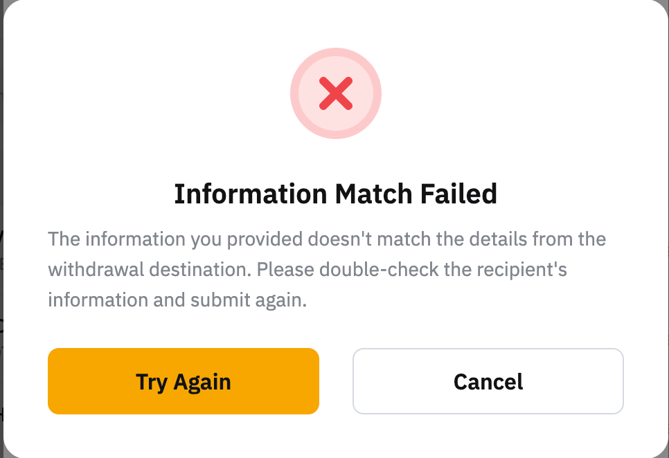 This is because the recipient information you provided does not match the details from the recipient's destination. Please ensure you fill in the correct information to submit your withdrawal request.