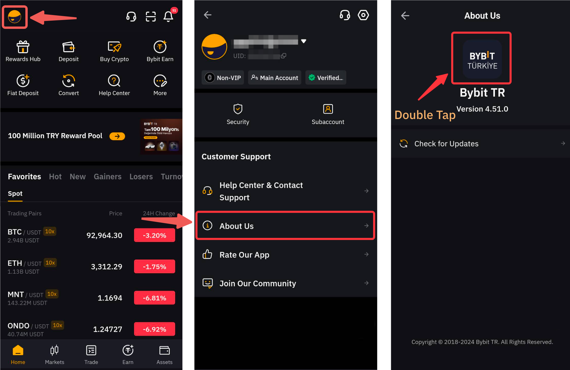 Step 5: To check more information about the App Version, you can double-tap the Bybit TR Logo and you should see more info about the App.