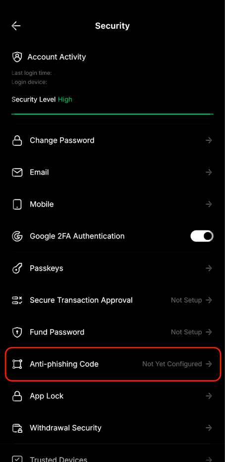To prevent phishing attempts, Bybit TR strongly suggests setting up the Anti-phishing Code via the website or the App. If you have not set up your Anti-Phishing Code, please go to your Account & Security page and follow this guide to get started.