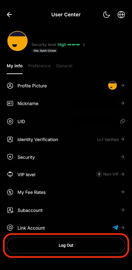 To log out your Bybit TR account through the app, you can go to your User Center and then click on the Log Out tab. For the website, you can click the profile icon on the top right corner (step 1) and then click on the Logout tab (step 2).