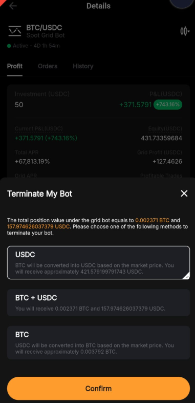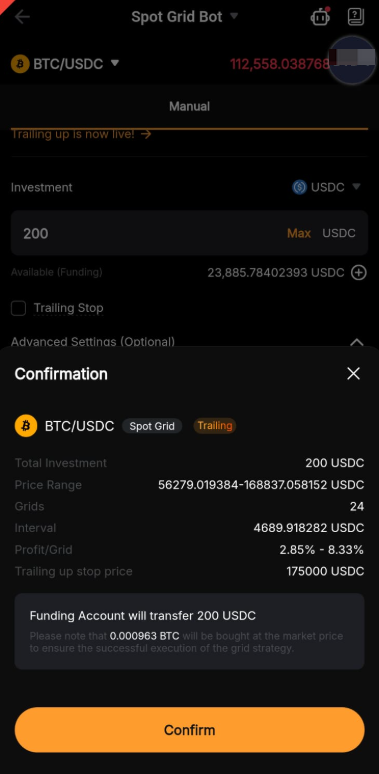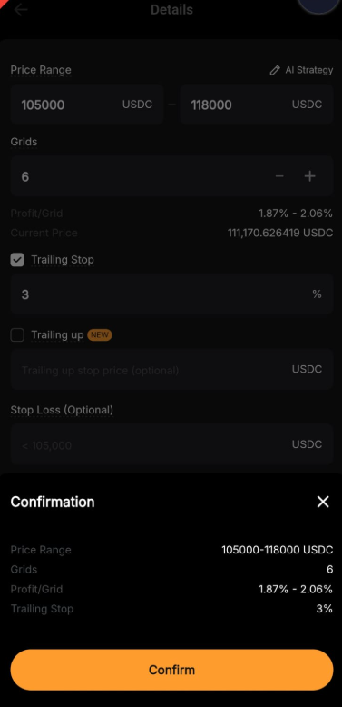 Step 4: Please double-check the grid bot information you’ve created, and then click on Confirm to start trading.