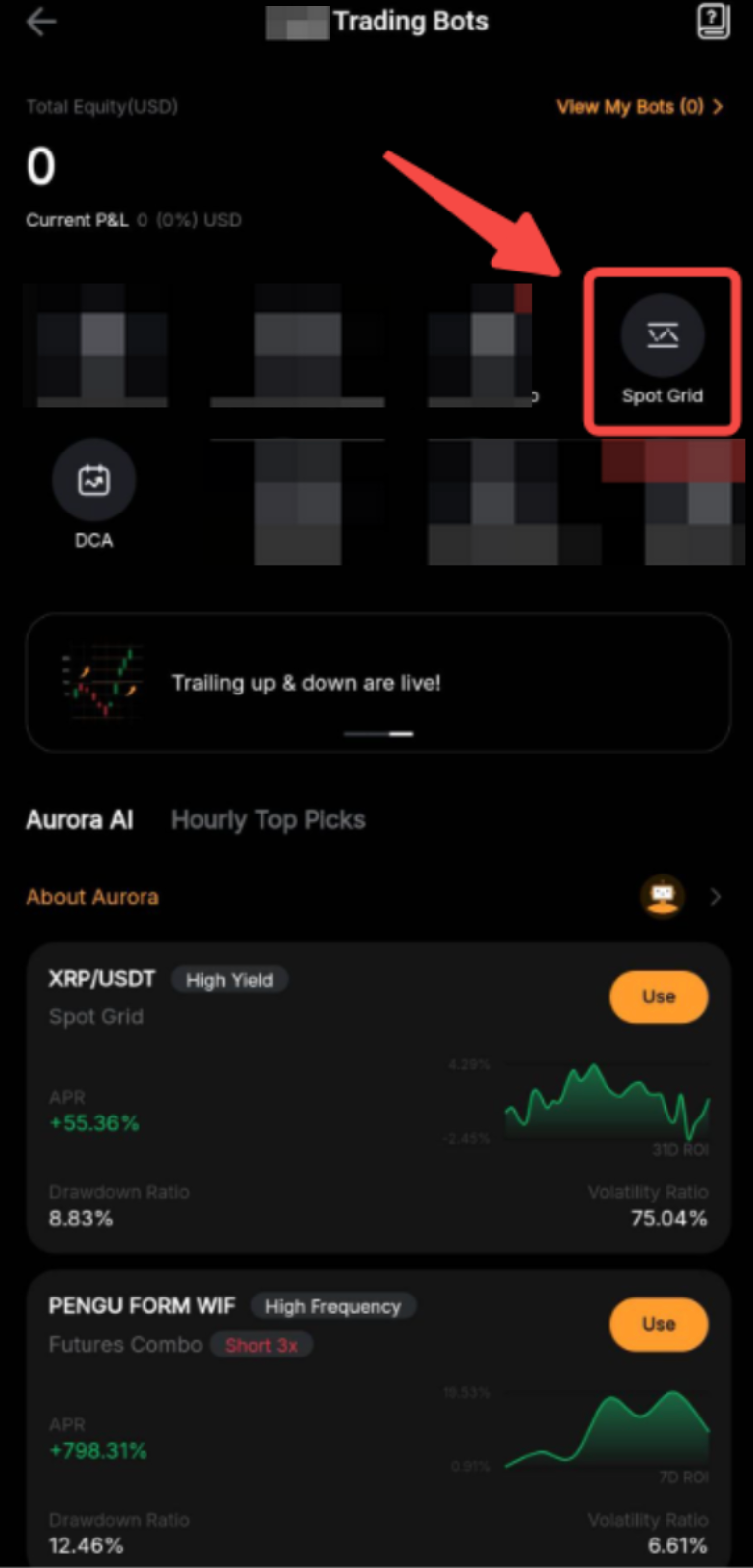 By using AI Strategy, the system will suggest the parameters based on the historical data performance of the Spot trading pair. Alternatively, you can also refer to the suggestion from Aurora’s Picks to create a Spot Grid Bot based on your preferences.