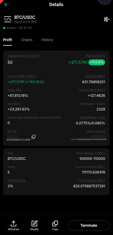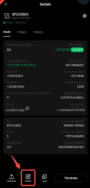 Step 1: Go to the details page of your Spot Grid Bot and click on Modify.