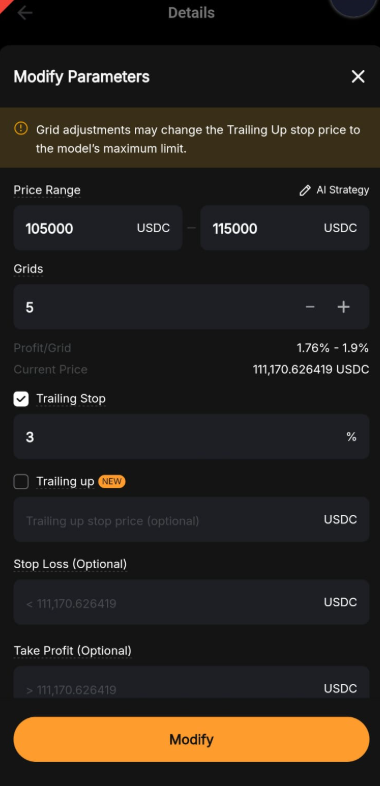 — The current modification parameters do not support independently changing Take Profit and Stop Loss settings. You must modify either the grid number or price range to adjust take-profit and stop-loss.