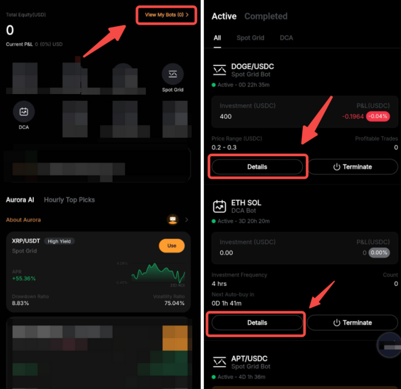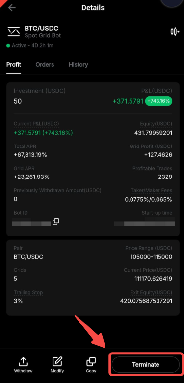 To terminate your Spot Grid Bot, go to the details page of your Spot Grid Bot and click on Terminate.