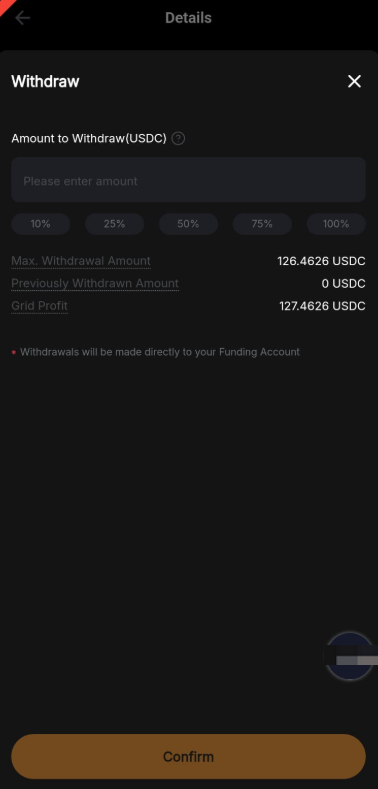 The maximum amount that can be withdrawn is your grid profit after the fee deduction. You can refer to the Max. Withdrawal Amount which is displayed on the withdrawal window. The withdrawn amount will be credited to your Funding Account.