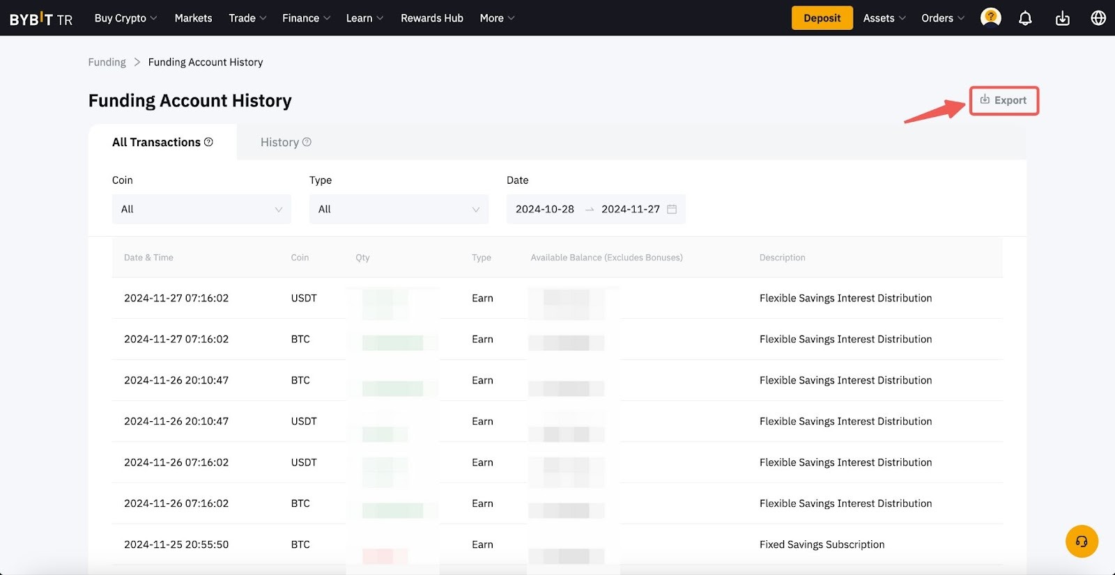 Step 1: To create your account statement, please click on Assets → Funding Account → History → Export or go to this page.