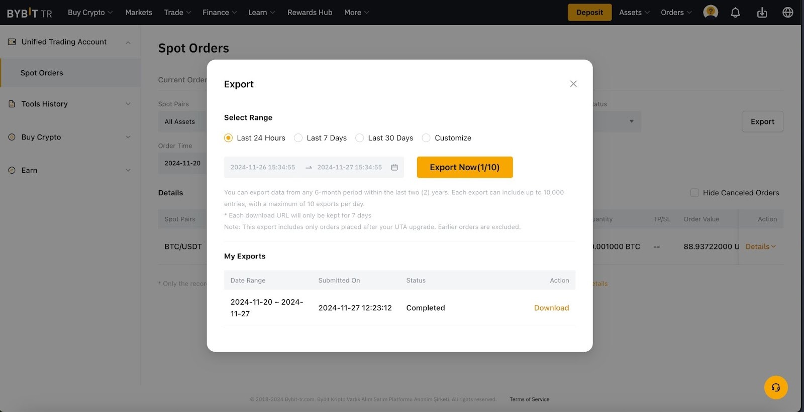 Here’s a guide on how to export your account data which include trades, orders, and account history, on Bybit TR. Please note that the account data export function is not available on the Bybit TR app.