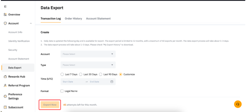 — Some data may not be available in the account statement, such as the Spot Order history. To export these data, please go directly to each Product History page and click on the Export button on the top right corner