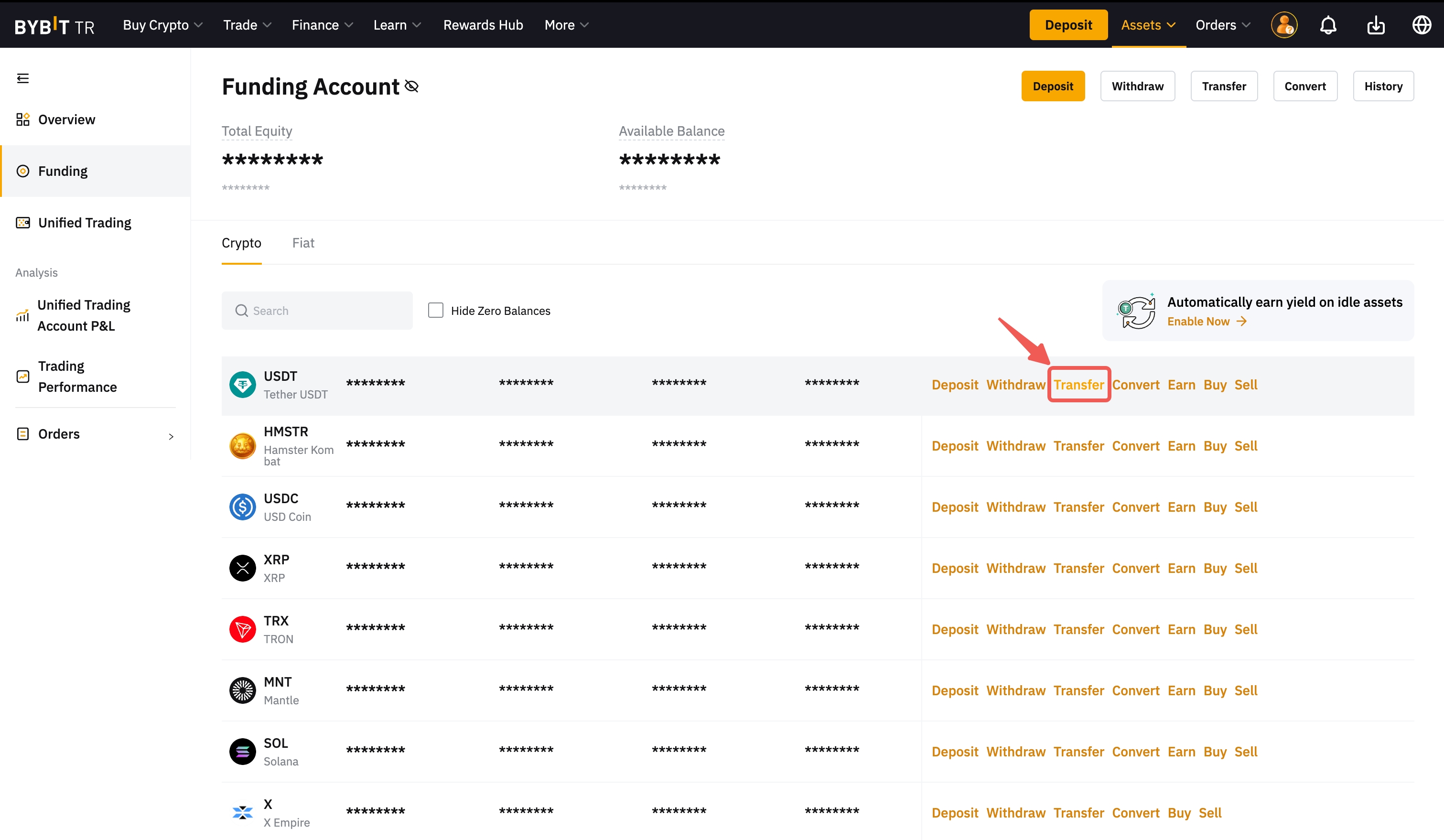 Step 1: On the Funding Account Assets page, click on Transfer in the column of the fiat currency you want to transfer.