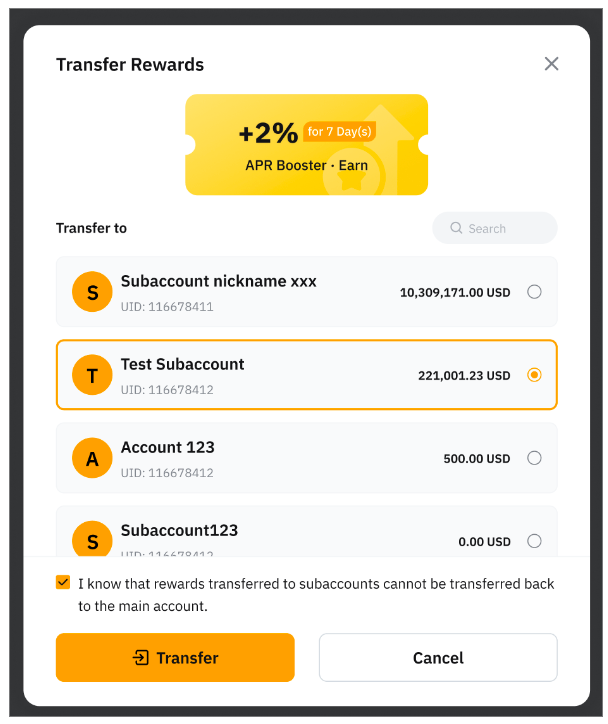 — Once the rewards are transferred to your Subaccount, they cannot be transferred back to the Main Account or to other Subaccounts. Ensure you select the correct reward and Subaccount before confirming the transfer.