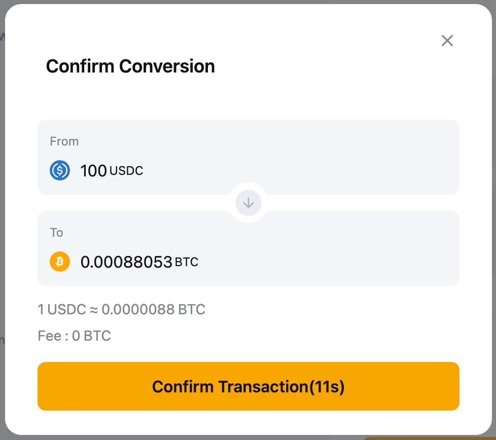 - Instant mode: Your assets will be converted immediately at the quoted price displayed on the page once you confirm the transaction.