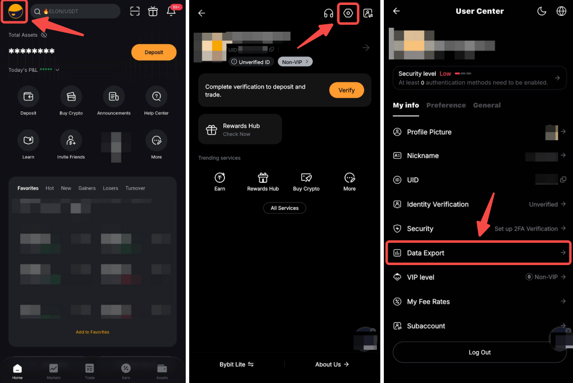 Step 1: On the Bybit TR Homepage, hover your cursor over your Profile, then go to Account → Data Export.