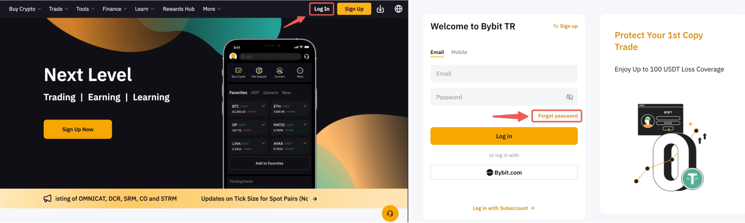 Please note that if you are still connected to your Bybit TR account but have forgotten your password, you will need to log out of your account and follow the steps below.