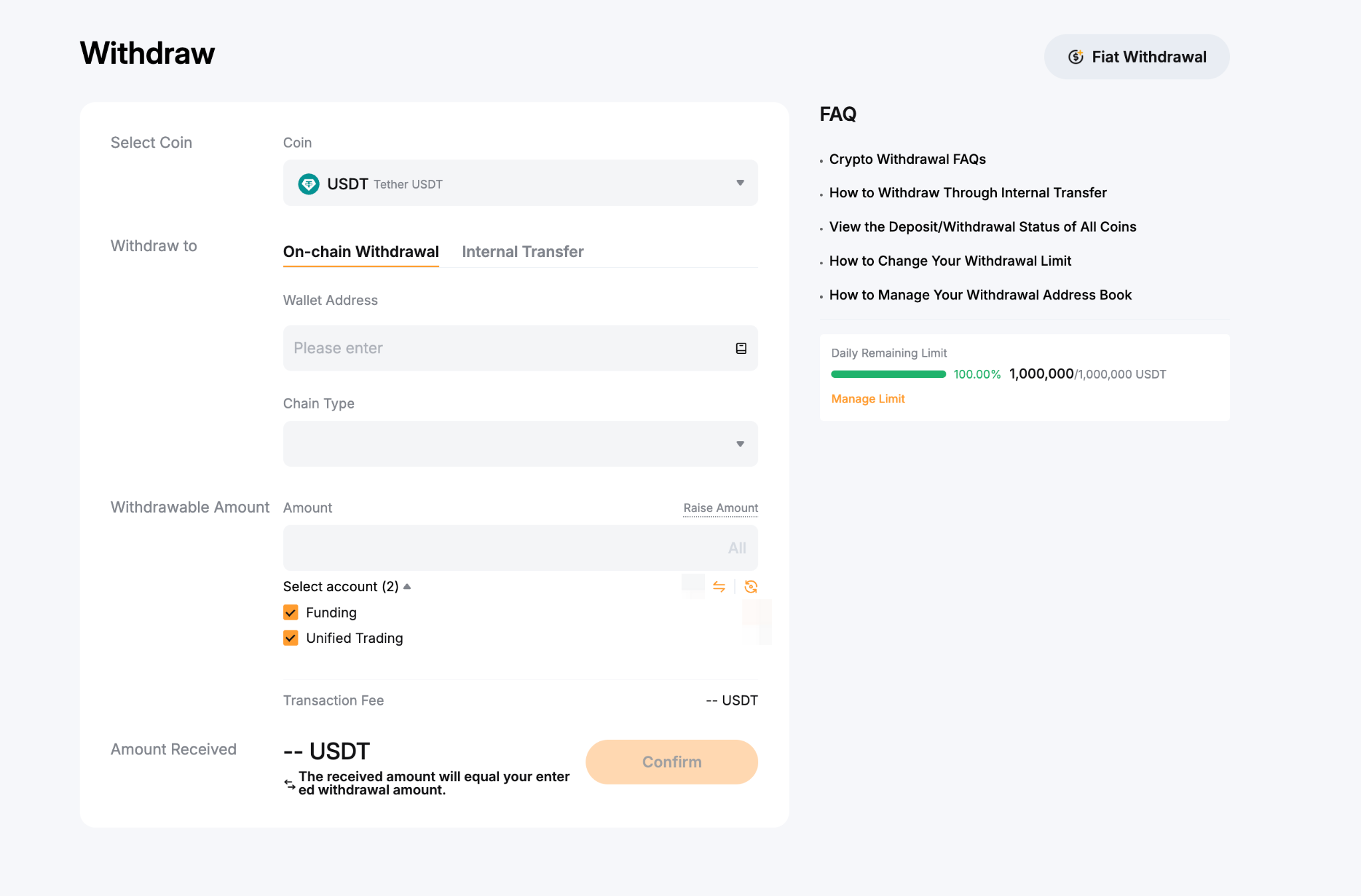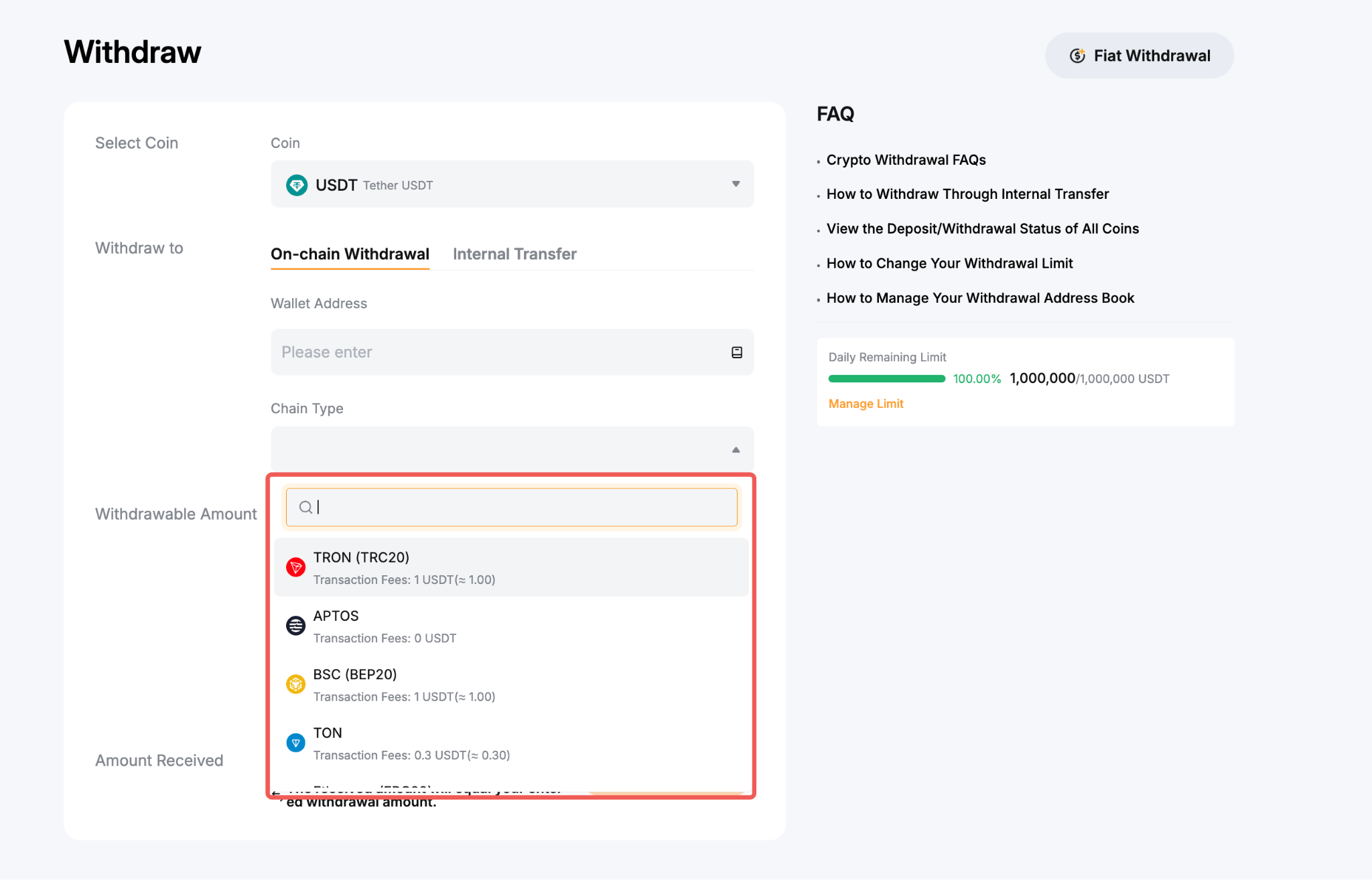 Here’s a step-by-step guide to help you submit an on-chain withdrawal request. For withdrawal via internal transfer, you can refer to here.