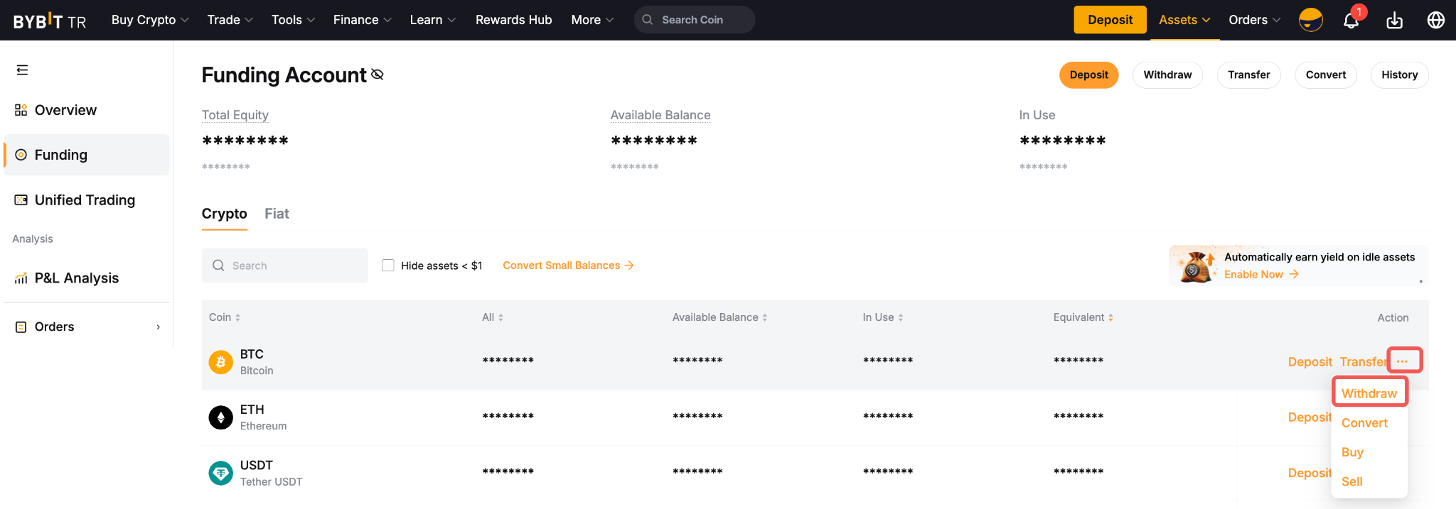 — Bybit TR supports withdrawals for coins listed on the Funding Assets page with an available Withdrawal button.