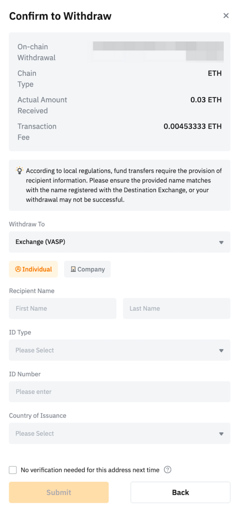 Note: The provided data must match the name and ID registered on the destination exchange. Otherwise, the withdrawal will fail and be cancelled. For a more detailed guide, please refer to the FAQ — Travel Rule.