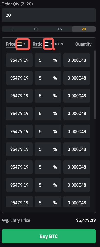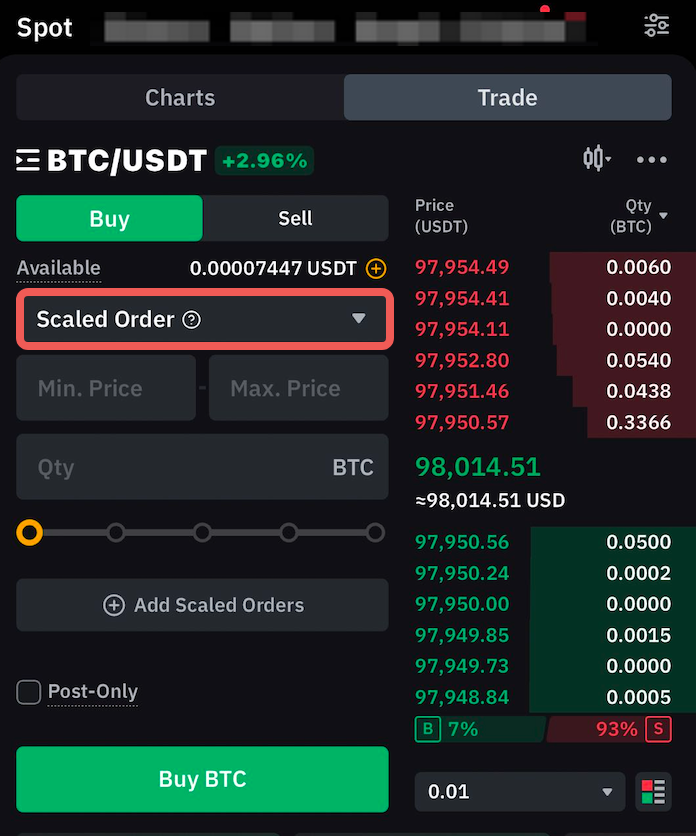 On the App, go to the Trade tab. Tap on the order type dropdown menu, select Scaled Orders, and input your preferred Price Range (the upper and lower bound of your scaled order) and Quantity for your scaled order.