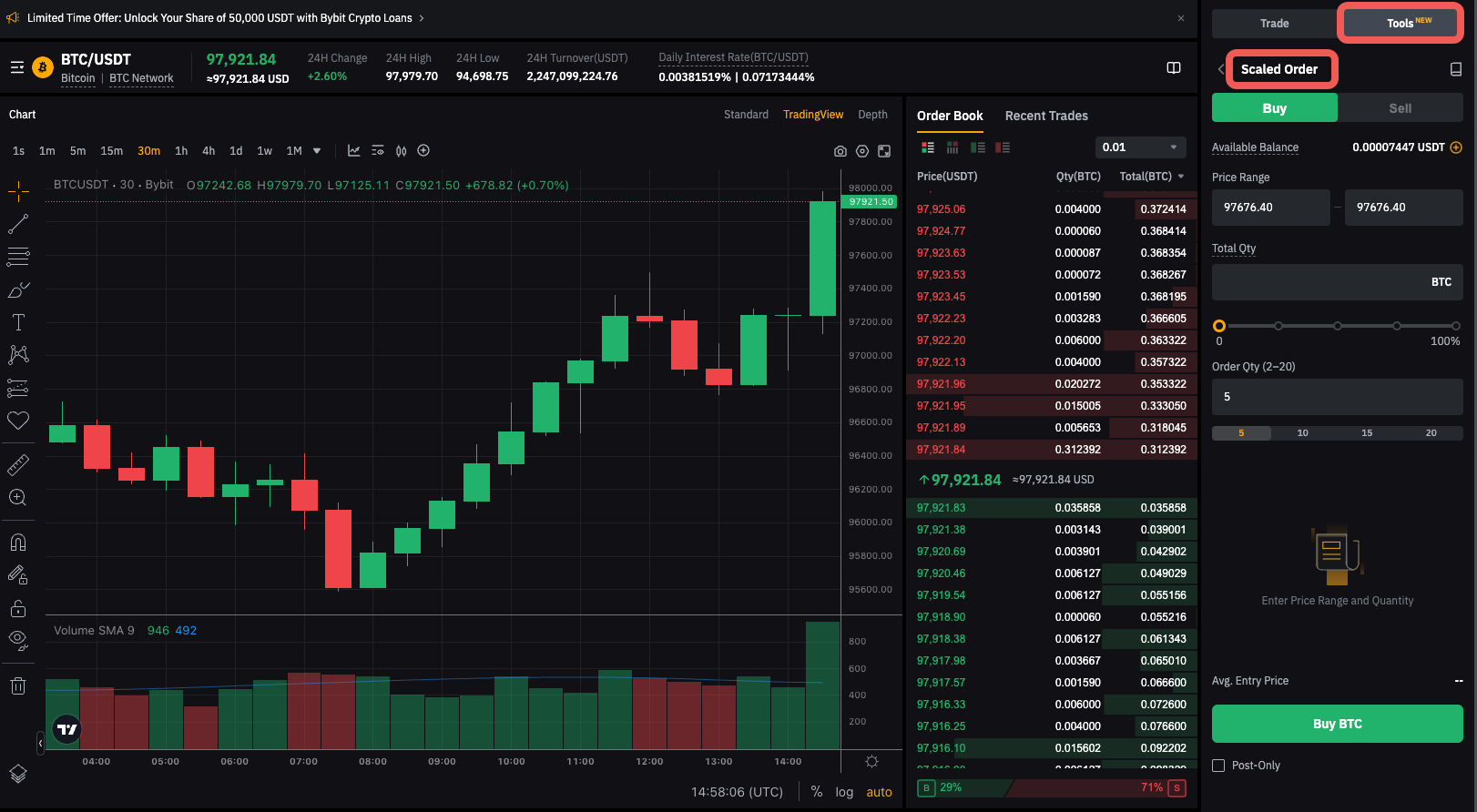 Step 3: On PC, click on the Tools tab and select Scaled Order. Input your preferred Price Range (the upper and lower bound of your scaled order) and Total Qty for your scaled order.