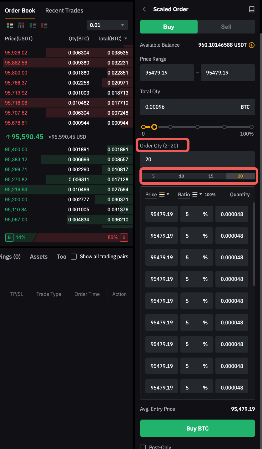 Please note that the minimum and maximum total quantity for a Scaled Order are 2 and 20 times the minimum and maximum order size. For example, the minimum and maximum order size for BTC/USDT are 0.001 BTC and 100 BTC. The minimum and maximum total order quantity for the Scaled Order will be 0.00096 BTC and 100 BTC respectively.