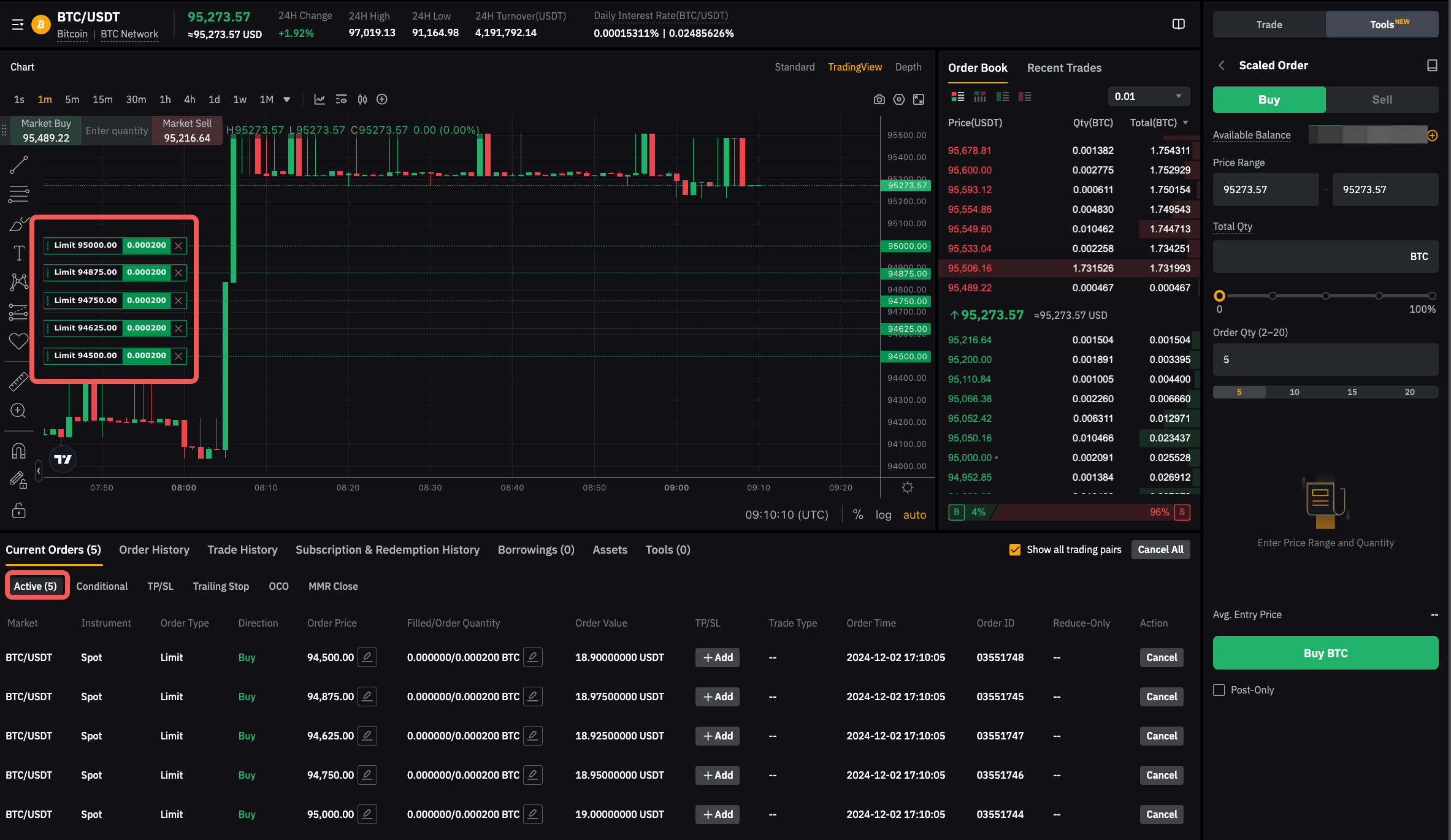 After submitting a scaled order successfully, your chart will be updated to reflect your scale order at different price variances accordingly. You can check your placed limit order from the Current Orders tab.