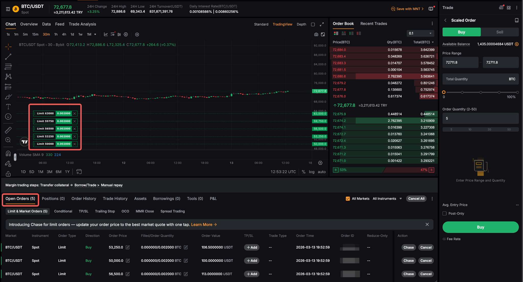 After submitting a scaled order successfully, your chart will be updated to reflect your scaled order at different price variances accordingly. You can check your placed limit order from the Open Orders tab.