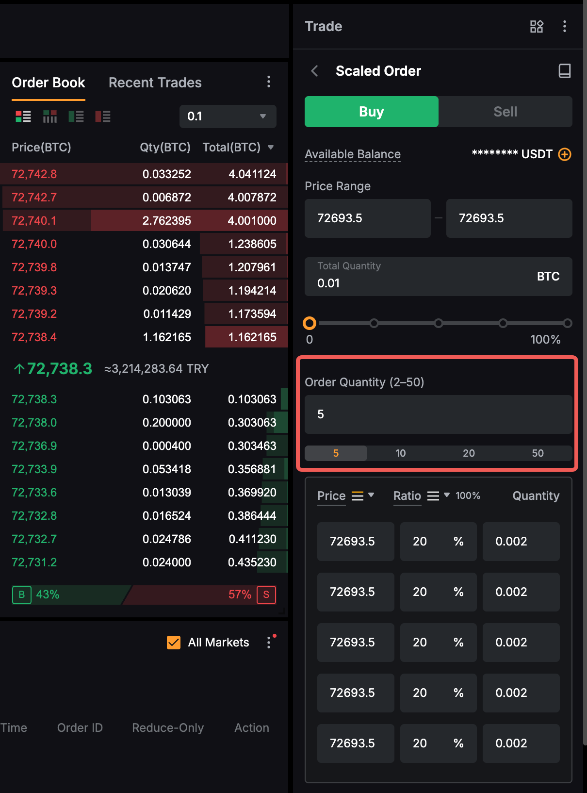 Please note that the minimum and maximum total quantity for a Scaled Order is 10 times the minimum and maximum order size. For example, the minimum and maximum order size for BTCUSDT are 0.001 BTC and 100 BTC respectively. Consequently, the minimum and maximum total order quantity for the Scaled Order will be 0.01 BTC and 1000 BTC respectively.