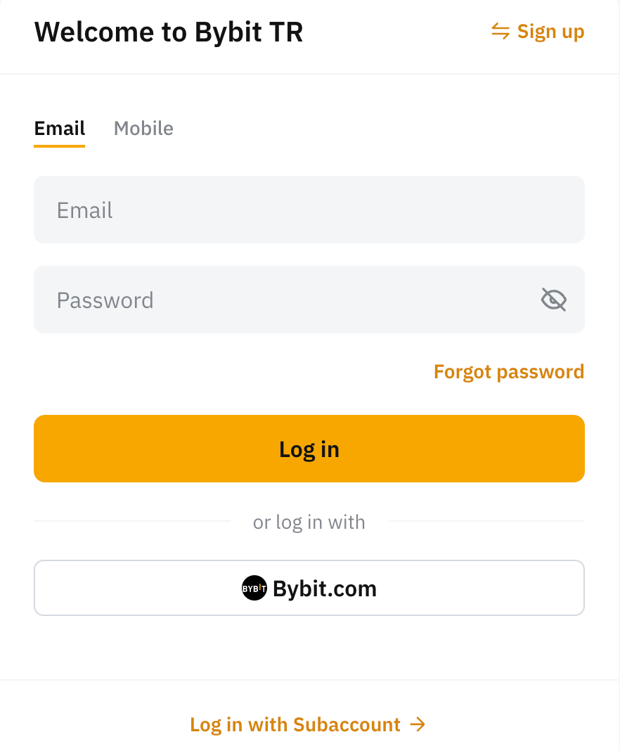 Step 1: Log in to your account via Bybit TR’s website. To do this, enter your registered email address or mobile number and your login password.