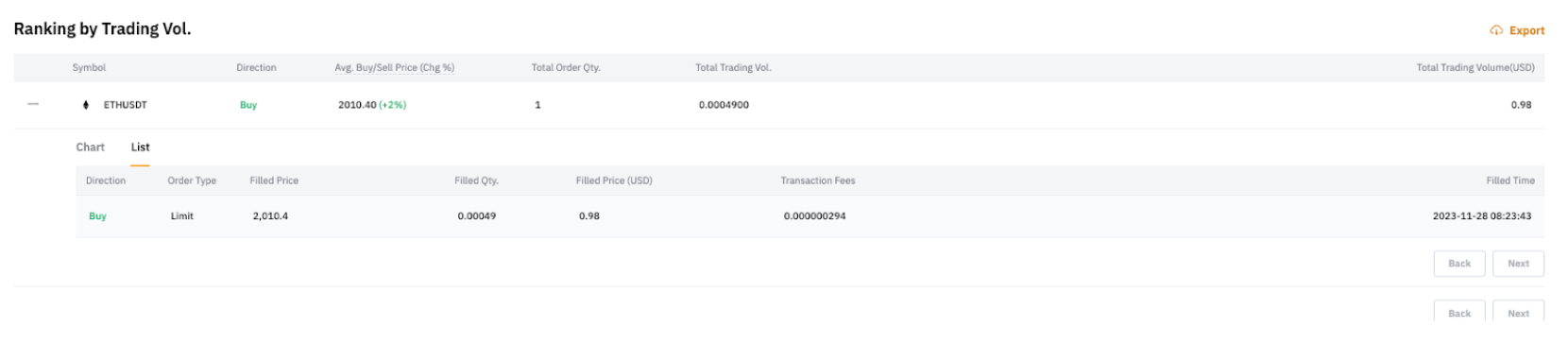 In the Ranking by Trading Vol tab, you can expand each symbol to view the Chart that shows your buy and sell points within the selected timeframe. Additionally, you can also select the time interval of the chart in the upper right corner and adjust the chart size.