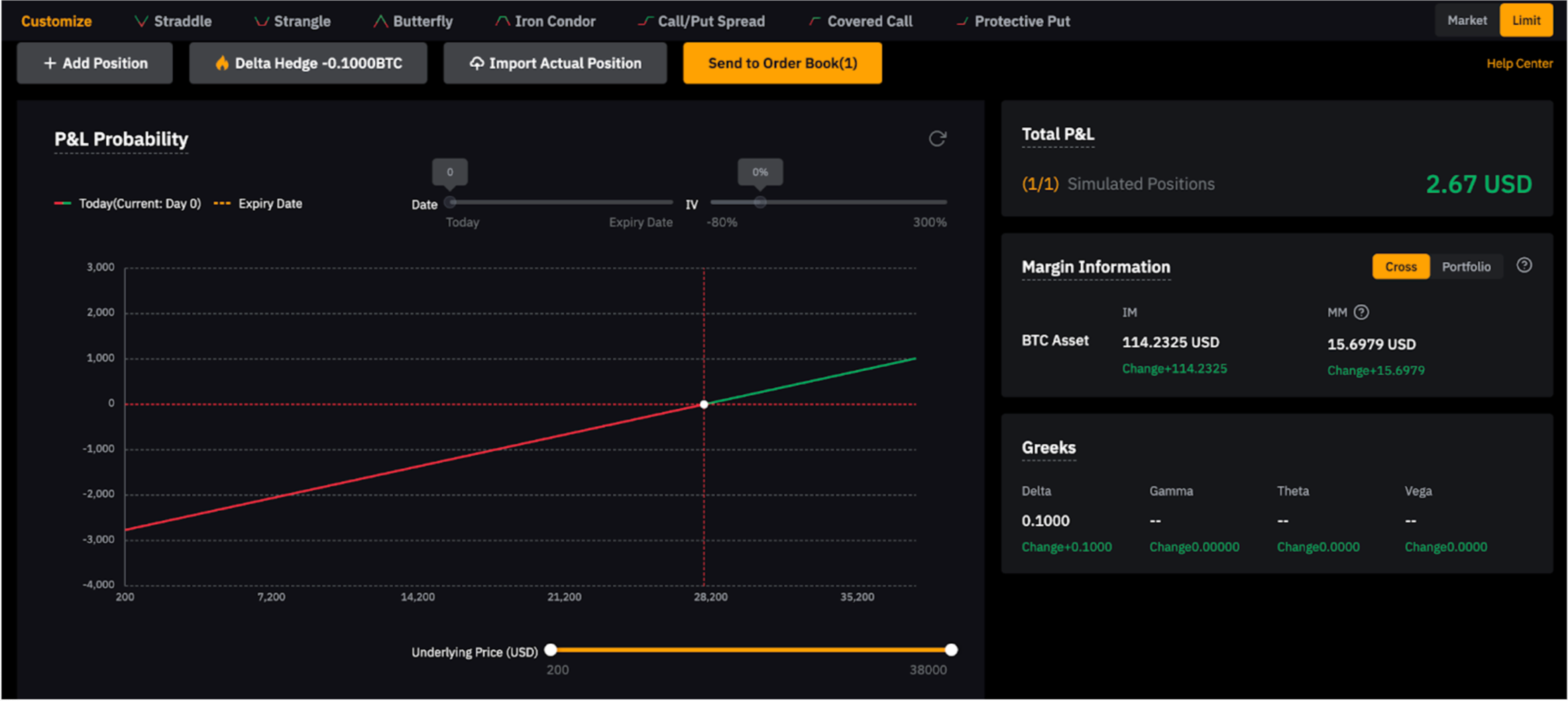 Stratejinizi daha da özelleştirmek için Delta hedge etme yönteminden yararlanabilirsiniz. Portföyünüz Delta riski içeriyorsa kullanılabilir hedge etme miktarınız sayfada gösterilecektir. Delta açısından nötr hâle gelmek için, risk hedge etmeye yönelik ilgili Vadeli İşlemler sözleşmelerini ekleyebilirsiniz.
