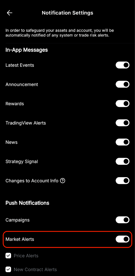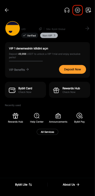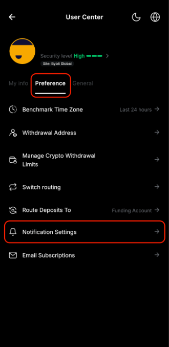 Bybit TR’in Pazar Uyarılarını kapatmak için, ana sayfanın sol üst köşesindeki profil simgesine ve Ayarlar simgesine tıklayarak Ayarlar sayfasına gidebilirsiniz. Ardından, Bybit TR Uygulamasından telefonunuza almak istediğiniz bildirim türünü tanımlayabileceğiniz Tercih → Bildirim Ayarları öğesine tıklayın.