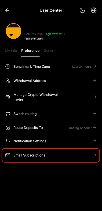 Bybit TR’in E-posta Aboneliğini kapatmak için, ana sayfanın sol üst köşesindeki profil simgesine tıklayıp Ayarlar simgesine tıklayarak Ayarlar sayfasına gidebilirsiniz. Ardından, kayıtlı e-posta adresinizde almak istediğiniz Etkinlik Hatırlatmalarını ve Genel Duyuruları özelleştirebileceğiniz Tercihler → E-posta Abonelikleri öğesine tıklayın.