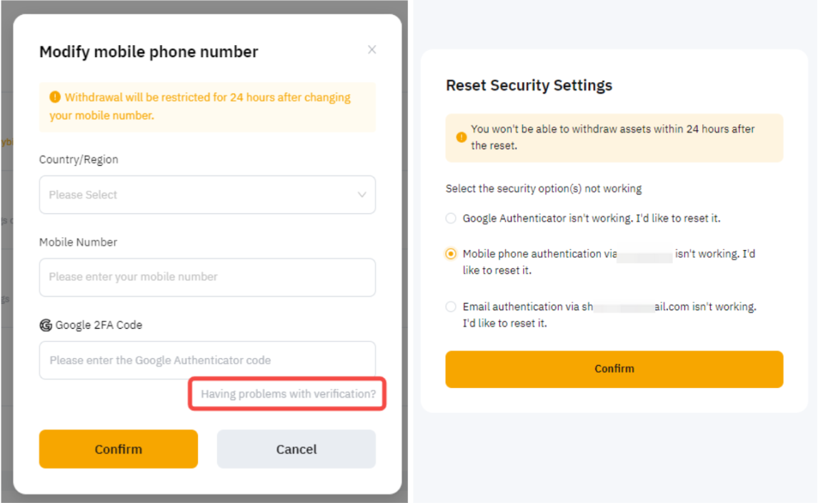 2FA kimlik doğrulama penceresinde, çalışmayan doğrulama yöntemini seçmek için Doğrulamada sorun mu yaşıyorsunuz? seçeneğine tıklayabilirsiniz. Bilgileri doldurduktan ve talebiniz onaylandıktan sonra müşteri desteğimiz 2FA kimlik doğrulamanızı sıfırlamanıza yardımcı olacaktır.