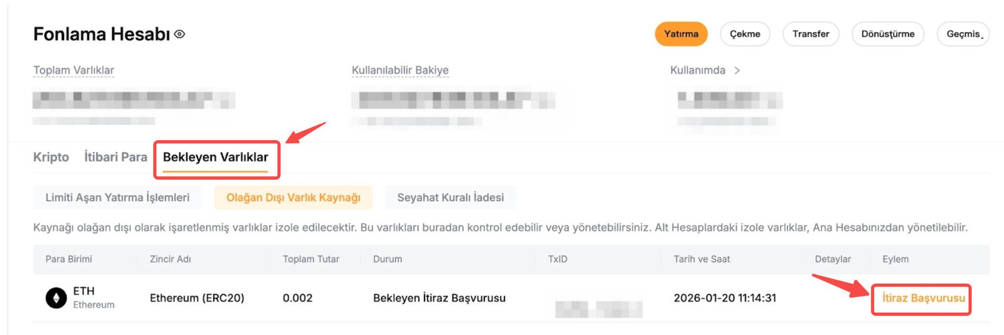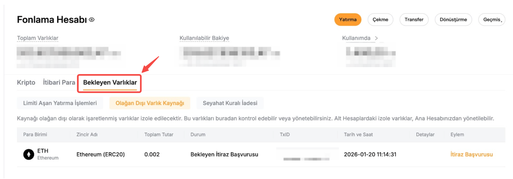 Adım 2: Bekleyen Varlık sekmesi altında, itiraz etmek istediğiniz para yatırma/çekme işleminin yanındaki İtiraz butonuna tıklayın.
