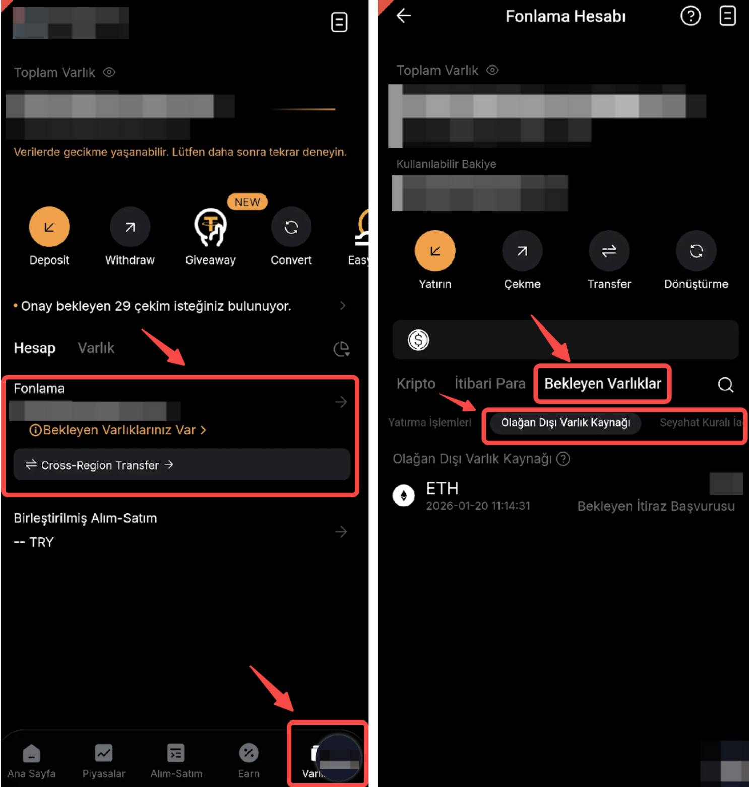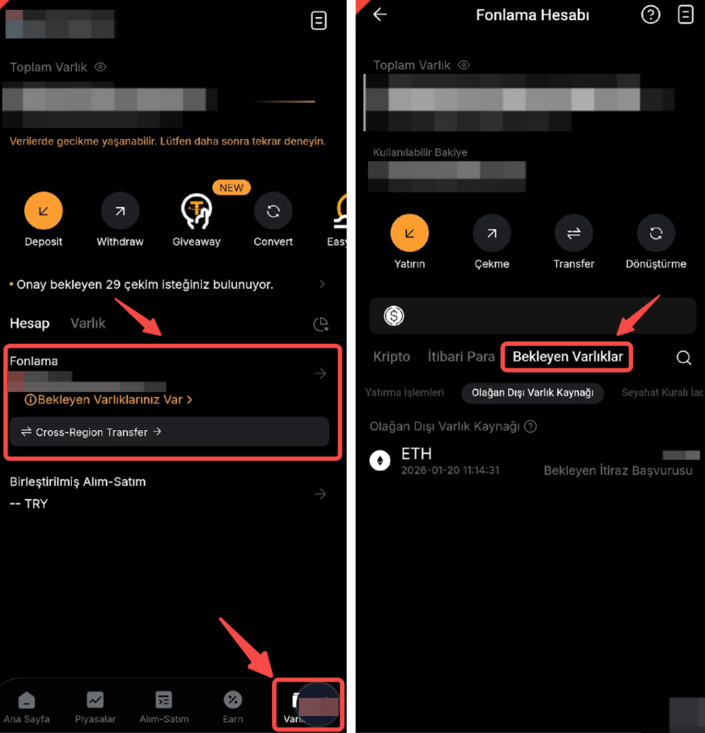 Bybit TR Uygulamasını kullanıyorsanız, lütfen Varlıklar sekmesine gidin, Fonlama seçeneğine dokunun, Bekleyen Varlıklar bölümünde inceleme bekleyen varlıkları görebileceksiniz.