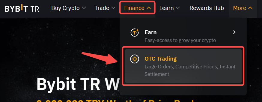 1. Adım: Gezinti çubuğundan Alım-Satım ögesini seçin ve Bybit TR OTC İşlemler ögesine tıklayarak Bybit TR OTC İşlemler sayfasına girin.